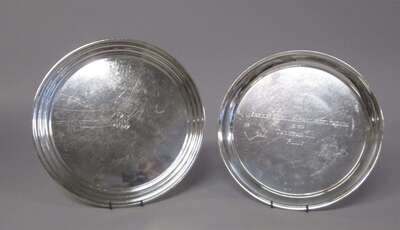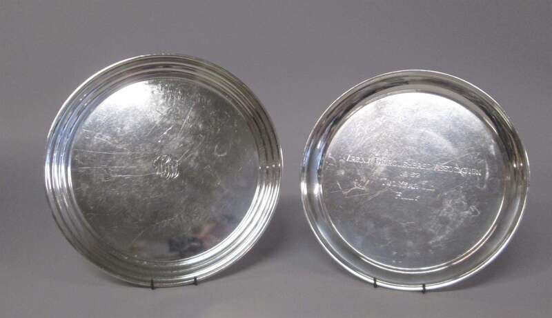 Each of circular form, including a Stieff commemorative tray, "Virginia Thoroughbred Association, 1962, Two Year Old Filly" engraved to center; S. Kirk & Son presentation tray, "From the Employees of Winburndale" engraved to underside.