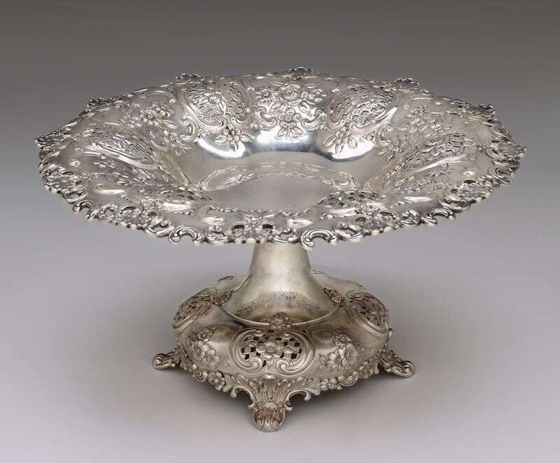 The bowl and foot pierced and repoussé-worked to show cartouches amongst floral blossoms and C-scrolls.