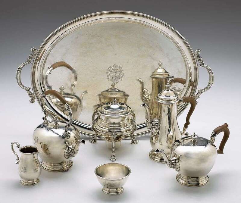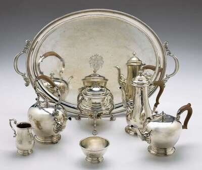 Comprising a hot water kettle on stand, tea and coffee pot with wood handles, covered sugar, creamer, waste bowl, and twin-handled tray, slightly bulbous in form with rocaille design throughout. Engraved with the crest of an eagle displayed, also to the underside: "R.C.K. from W.J.K., 1950." (7).