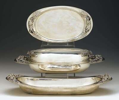 Comprising a large covered tureen, vegetable dish, and shallow dish, each of oval form in the style of Georg Jensen with applied grapevine motifs. (3).