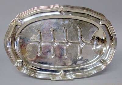 Oval form with shaped reeded rim.
