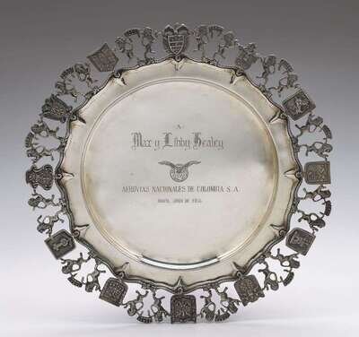 Of circular form, the rim cast with alternating lions and armorial decoration, 900 standard. The center engraved: "Mary Libby Healey, Aerovias Nacionales de Colombia S.A., Bogota Junio de 1956."