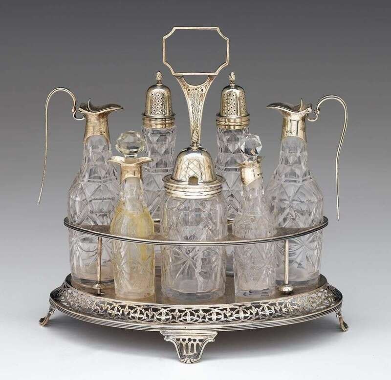 John Robins oval stand on four openwork feet, central canted hexagonal handle, the base with pierced floral border, London, 1797-98, fitted with seven Victorian silver mounted glass vessels, with marks for John Bell & Frederick Brasted, London, 1860-61. The stand engraved with the Peel family crest of a demi-lion rampant gorged holding a shuttle between its paws.