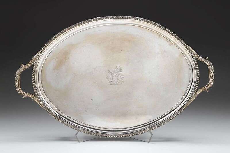 Oval form raised on four feet terminating in volutes, gadrooning to edges with foliated handles. Bearing the Cooke family crest of a demi lion guardant gorged with a ducal coronet issuing from a mural crown.