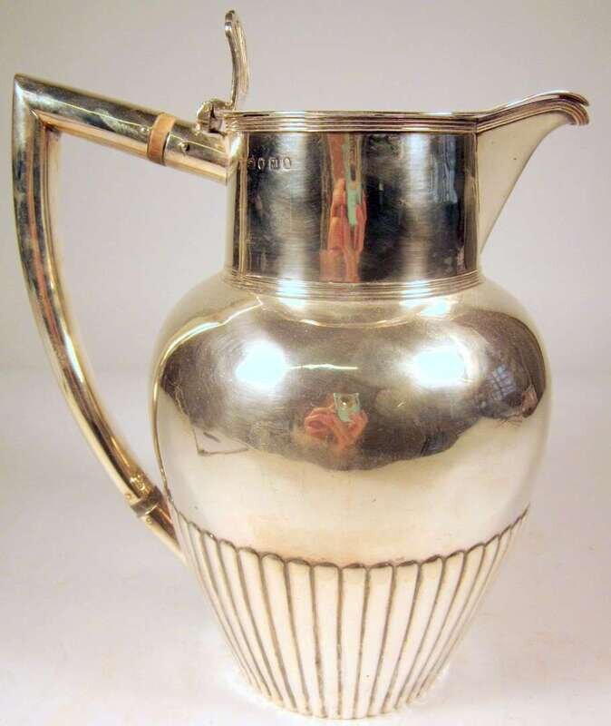 The hinged lid over a baluster form body with fluted lower half, high angular handle and pierced thumbpiece.