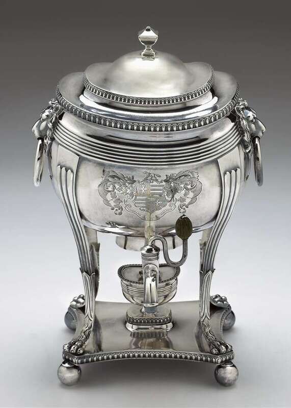 Plain body with twin lion's head ring handles, raised on four reeded legs terminating in hairy lion's paws and set on a canted rectangular platform on four ball feet. Engraved with the Homfray coat-of-arms with crest above of an otter wounded in the shoulder by a spear, the motto "Vulneratur non vincitur" below.