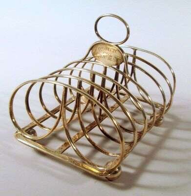 Six division rack on four ball feet. Reserve below ring handle engraved with monogram to one side and family crest of an eagle rising erminois to the other.