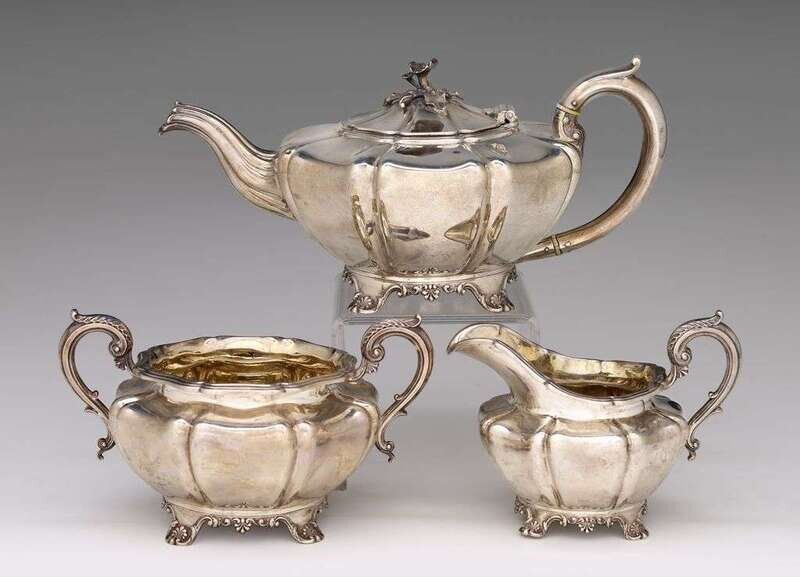 Comprsing a teapot, sugar bowl, and creamer, fluted octagonal form raised on shell and scroll feet, the teapot with cast mushroom finial, the sugar and creamer with gilt-washed interiors and foliate-capped handles. (3).