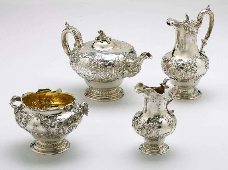 Comprising a tea and coffee pot, creamer, and open sugar, profuse floral design with foliate-capped handles and gilt-washed interiors. Engraved with the crest of a dove standing atop a tower, the teapot with coat-of-arms. Varying date letters 1839-40, 40-41 and 43-44, the teapot with marks for John Wrangham & William Moulson. Scratch weight to underside. (4).