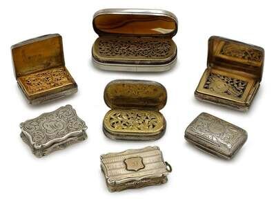 Various forms with gilt-washed interiors, the grilles pierced and engraved with scrolling floral and foliate designs, one depicting a musical instrument, five with Birmingham marks including John Shaw, 1808-9; Thomas Shaw, 1835-36; Francis Clark, 1836-37; Edward Smith, 1850-51; Alfred Taylor, 1853-54; and one with London marks for 1805-6, maker's mark ID. Together with a silver-mounted polished agate vinaigrette, unmarked. (7).