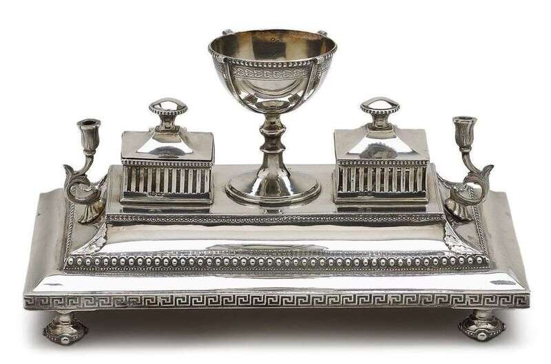 The stand of rectangular form with Greek key border, the platform above with beaded edge and applied acanthus leaves to each corner, supporting two inkwells.