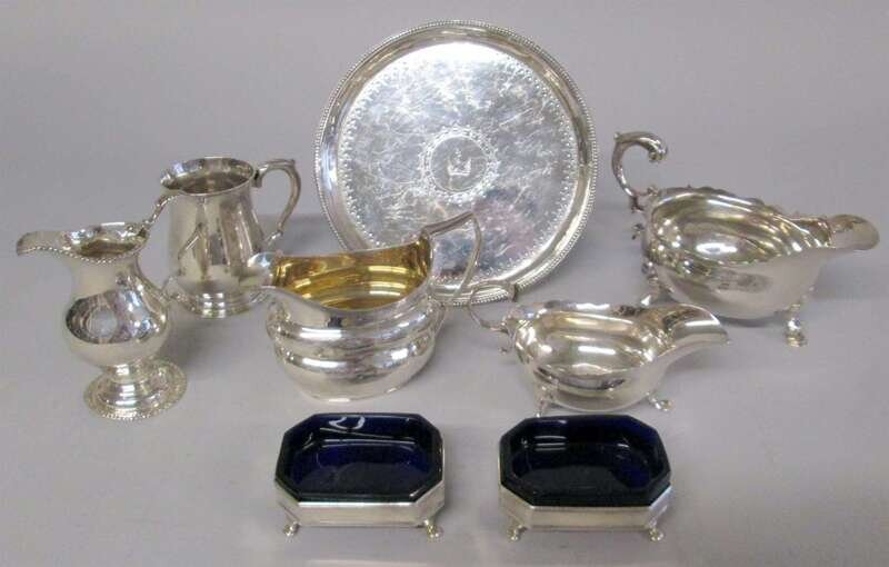 Including a Thomas Whipham sauceboat, 1746-47; Alexander Saunders creamer, 1763-64; Robert Metham creamer with gilt-washed interior, 1808-9; Scottish stipple-engraved waiter, 1786-7, maker's mark WD; a mug, maker's marks rubbed, 1788-89; and a sauceboat with marks for Newcastle. Together with a pair of Belgian silver salts with cobalt glass liners. (8).