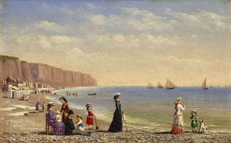 JOHN WATKINS CHAPMAN (BRITISH 1823-1903) "BEACH WITH FIGURES, CLIFFS ALONG ENGLISH COAST"