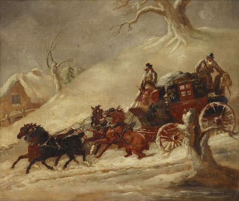 JOHN CHARLES MAGGS (BRITISH 1819-1895) THE BATH-LONDON MAIL COACH, WINTER