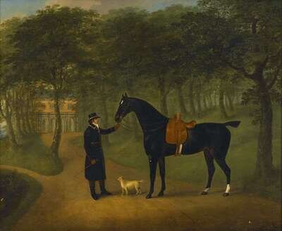 JOHN NOST SARTORIUS (BRITISH 1759-1828) "A SADDLED HORSE WITH GROOM OUTSIDE A COUNTRY HOUSE"