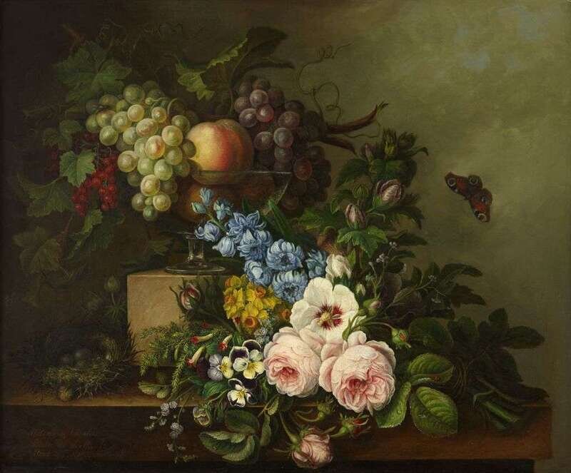AFTER MELANIE DE COMOLERA (FRENCH ACTIVE 1816-1854) MIXED FLOWERS WITH A GLASS COMPOTE OF FRUIT, A BIRD'S NEST AND BUTTERFLY