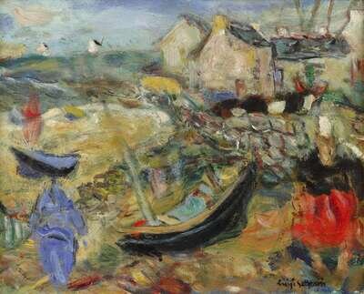 LUIGI SETTANNI (AMERICAN 1909-1984) FIGURES AND BOAT ON THE SHORE
