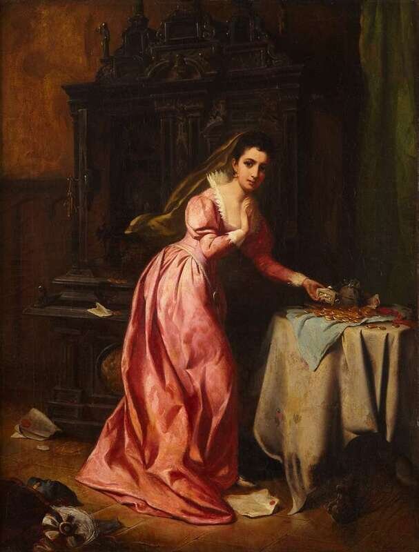 DANIEL RIDGWAY KNIGHT (AMERICAN 1839-1924) "WOMAN WITH GOLD COINS" (DIVIDING THE PROFITS)