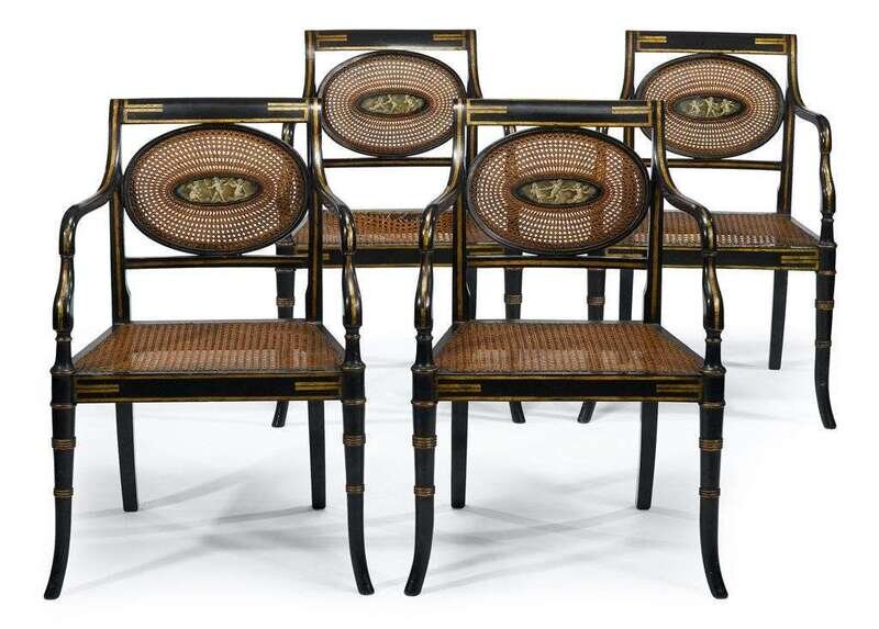 Set of four Regency style ebony, gilt painted, and cane upholstered armchairs early 20th century