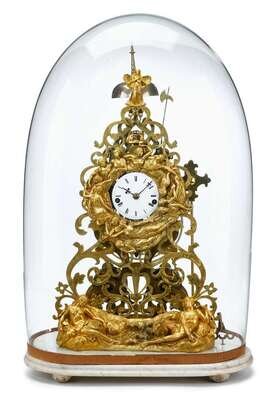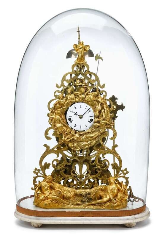 The circular white enameled dial with Roman numerals within openwork foliate scroll engraved case mounted with pressed brass appliques showing classical maidens and a gentleman, raised on stepped marble base on half ball feet, housed under a glass dome.