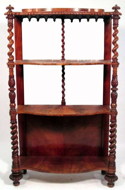 The serpentine top with gadrooned edge, over mirrored back and three shelves with bold spiral twist supports, raised on gadrooned feet.