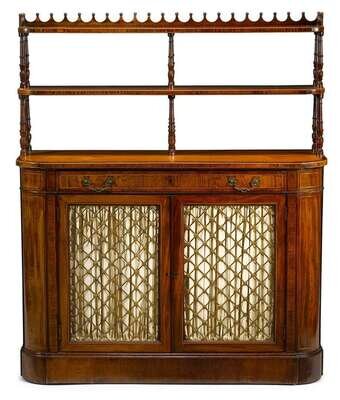 The galleried superstructure with two graduating tiers on turned supports, over a D-shaped rosewood crossbanded satinwood top, above a long drawer and two gilt metal lattice panelled doors, raised on plinth base.