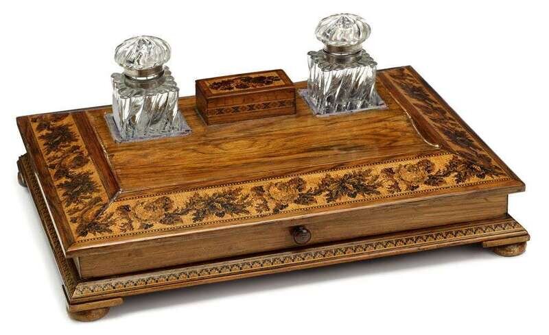 Rectangular form, supporting two hinged fluted inkwells flanking lidded stamp compartment, within an intricate floral inlaid border, above a shallow drawer, raised on flattened bun feet.