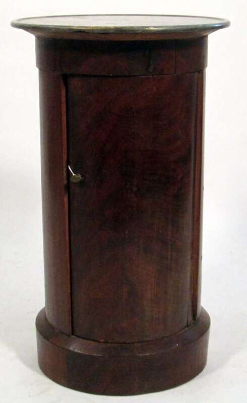 The grey-veined circular and dished marble top over cylindrical case with single cupboard door, raised on plinth base.