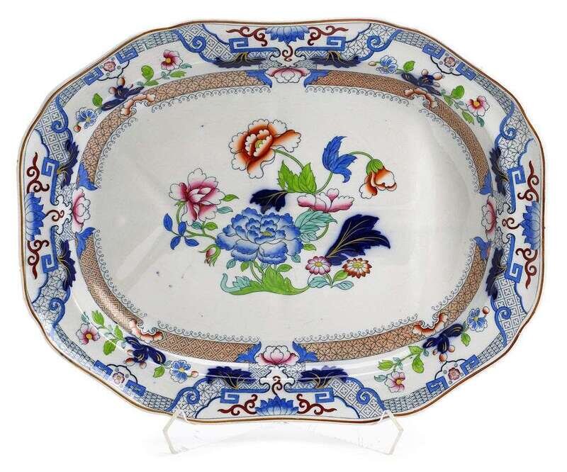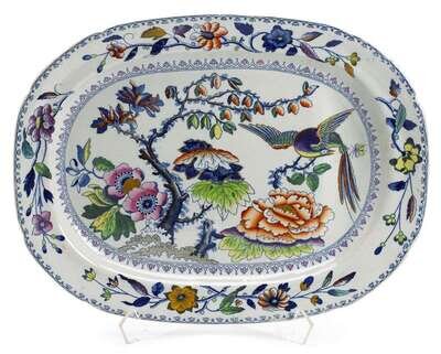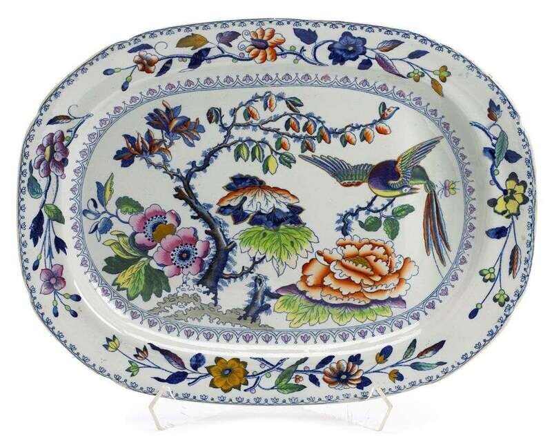 Both of oval form and polychrome painted in the Chinoiserie style, one Davenport stoneware, painted with a central scene of a long tailed bird beside a blossom tree and flowers, within a border of flowers; the other Copeland, centrally painted with a floral bouquet within a border of flowers and trellis.