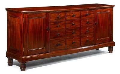 The rectangular top over central arrangement of twelve drawers, each with original lock stamped "Hobbs & co, London", flanked by cupboard doors opening to slots for folio dividers, raised on fluted cylindrical feet.