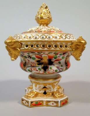 The pierced floral painted lift-off cover surmounted by grape-cluster finial, above similarly painted pierced campana form urn mounted with mask handles, raised on claw form feet over quadrapartite plinth base. The underside with red painted crown mark over lines and 'D'.
