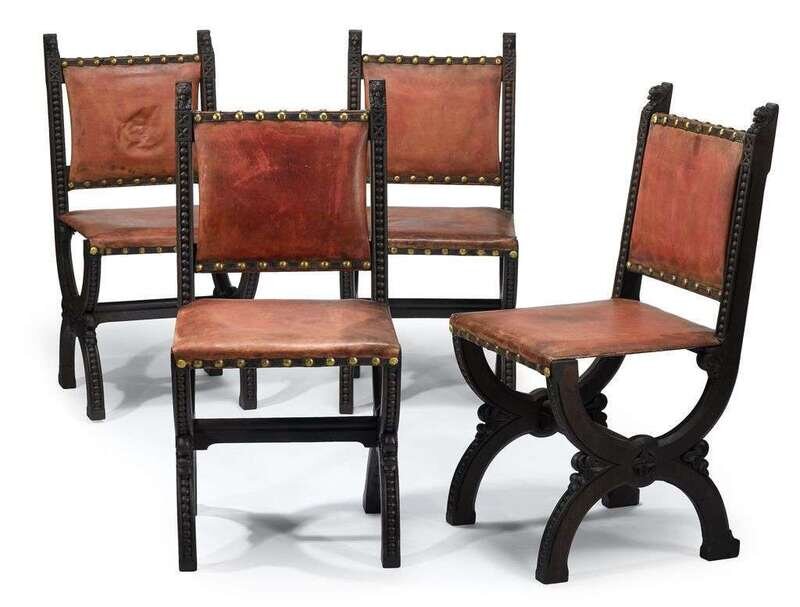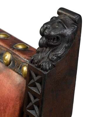 The padded square studded leather back over square leather stuff over seat, raised on x-form legs, the bead and star carved back uprights headed by lion's masks, the x-form legs centered by a quatreform star and leaf carved at the joins.