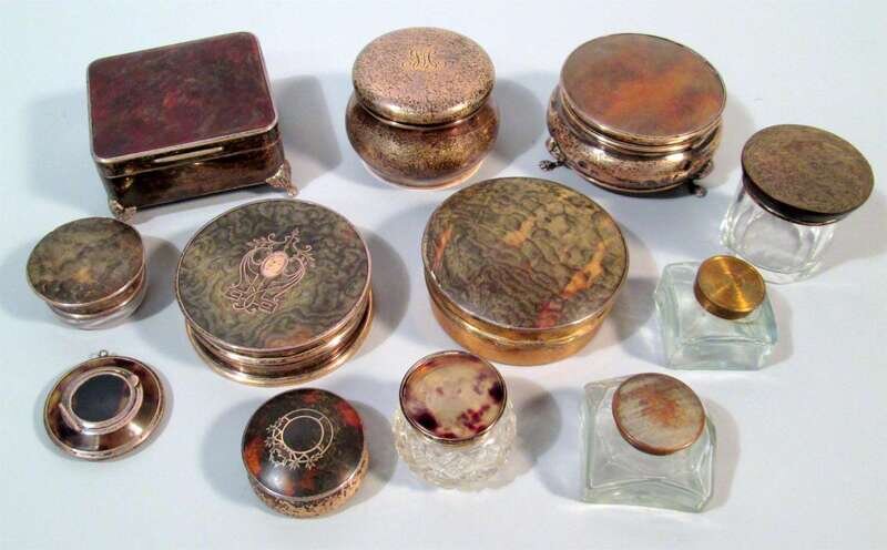 Including five silver boxes with tortoiseshell lids (two inlaid with silver), a pendant, and five glass vessels, three with tortoiseshell covers. Together with a Tiffany & Co. squat silver box. (12).