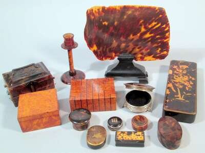 Comprising an English silver and tortoiseshell box, of circular form, hallmarked Birmingham 1848; a tortoisehsell candlestick; a French locket; a small Japanese lacquered box; a Japanese lacquer brush box with tortoisehell veneered cover; three small boxes; a small horn snuff box with tortoiseshell veneered lid; a Chinese tortoiseshell hinged compartment jewelery box; and a tortoiseshell section mounted on ebonised stand; together with two wooden boxes. (13).