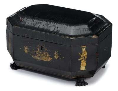 Chinese export black lacquer and gilt painted tea caddy 19th century