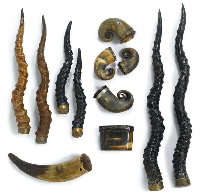 Four each in the form of antelope horns and ram's horns, one with mount engraved with the thistle of Scotland, and two others, one horn with wood cover and another of box form. (12).