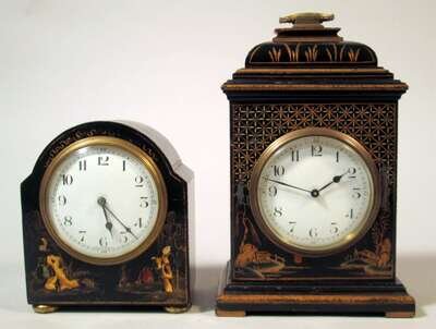 Each with circular white enameled dial and Arabic numerals, within gilt decorated black Chinoiserie lacquer cases.