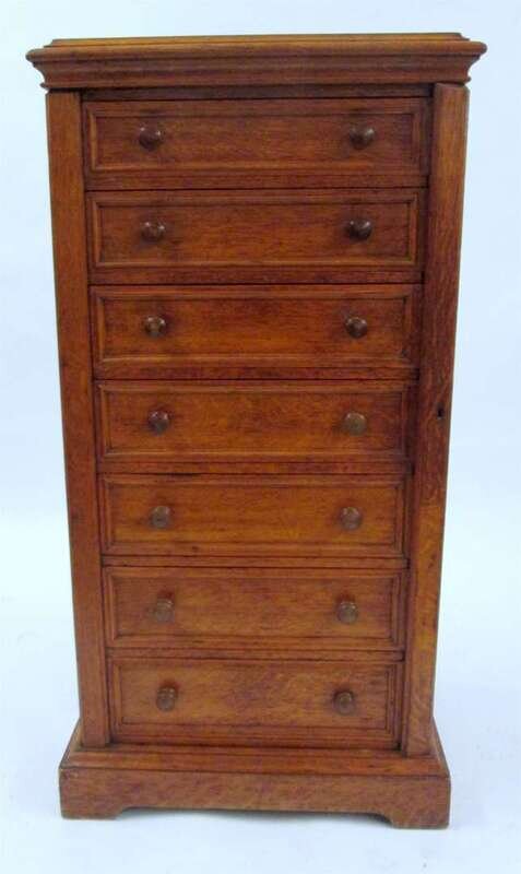 The shaped top with molded edge over seven graduating channel molded drawers with hinged lock mechanism to the right side, raised on plinth base.