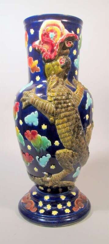 Of baluster form with elongated neck, depicting a dragon modelled in relief and posed against the night sky further surrounded by clouds and stars, turquoise interior.
