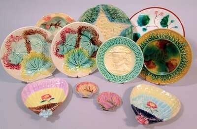 Comprising an Etruscan majolica cauliflower plate; three albino geranium leaf plates; lobed woven interior floral branch dish; mottled green and brown plate; relief portrait plate in cream with green border; two fan form dishes; and two shell-shaped butter pats. (11).