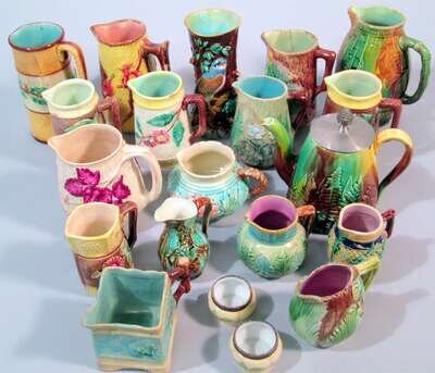Collection majolica pitchers and creamers second half 19th century