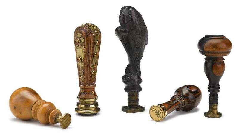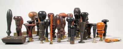 Of varying shapes and sizes, mostly with turned handles, some ebonized, one with carved figural handle in the form of a crane peering down at a frog, and one each with railroad and bank seals. (Approx. 39).