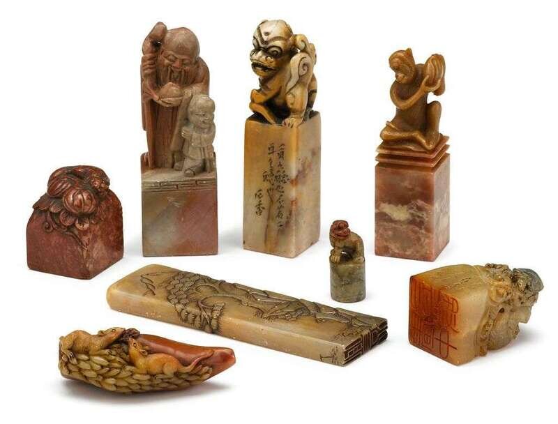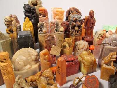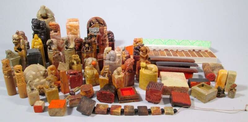 Various shapes and sizes, mostly carved soapstone seals with figural finials, three in fitted wood cases with sliding lids. (Approx. 73).