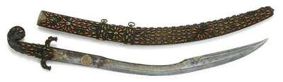 The curved watered steel blade with continuous Qur'anic script along its length, the handle and scabbard profusely decorated with inset coral and turquoise cabochons.