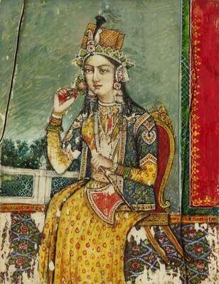 Rectangular plaque painted depicting Mughal beauty, possibly Nur Jahan, framed and glazed.