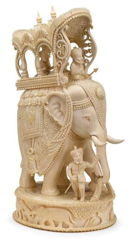 The elephant with full howdah enclosing three seated attendants, being led by an additional attendant, raised on beast and foliate carved base.