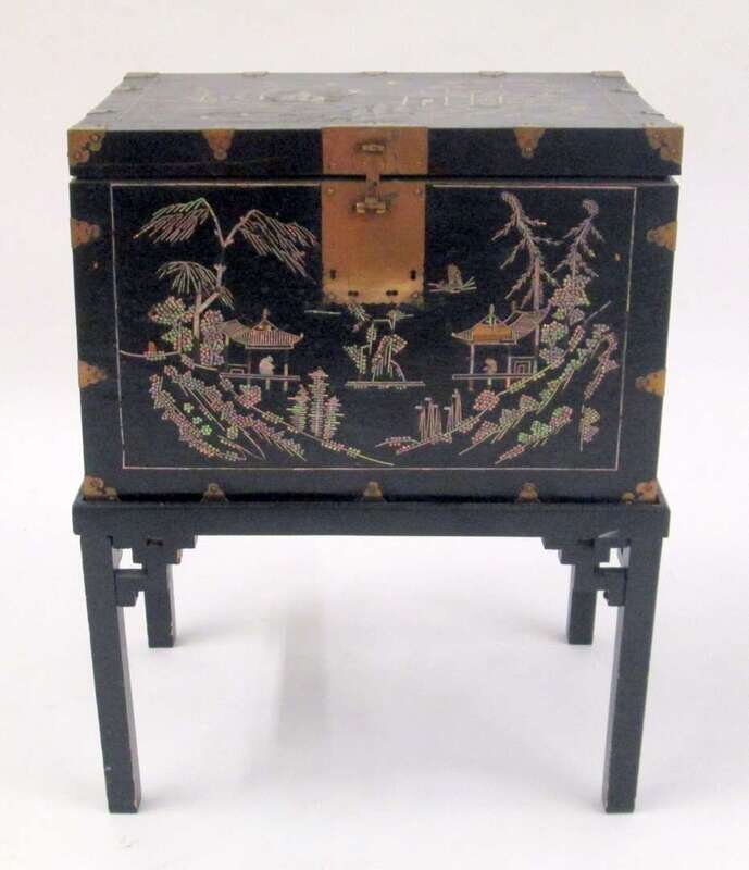 Chinese Export abalone inlaid and brass mounted black lacquer chest on stand late 19th/early 20th century