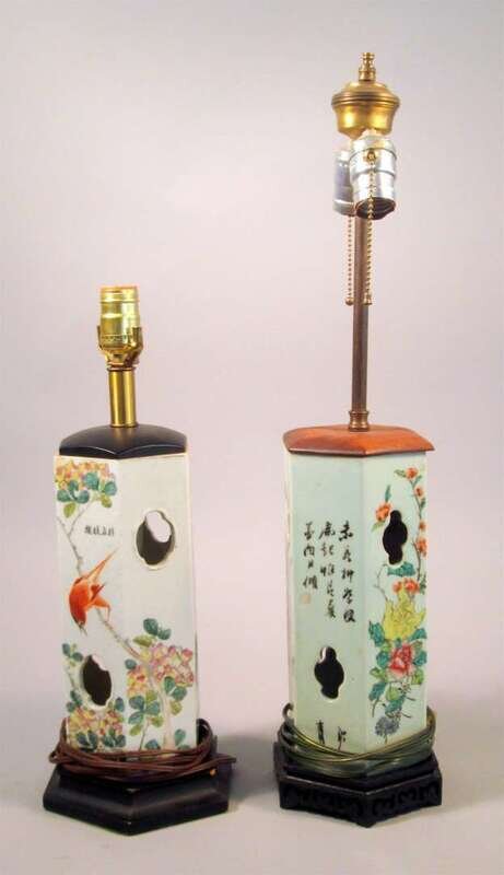 Hexagonal form, one stand painted with a mountainous landscape, flowers, and a group of three figures, the other showing a bird perched in a tree, converted to lamps.
