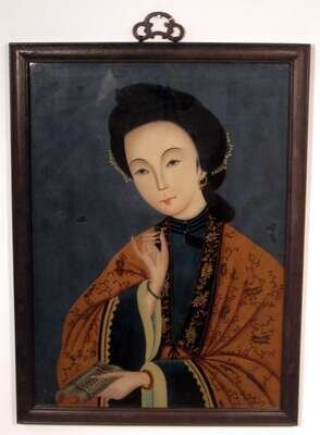 Painted to show a lady in traditional robes holding a book, within hardwood frame.