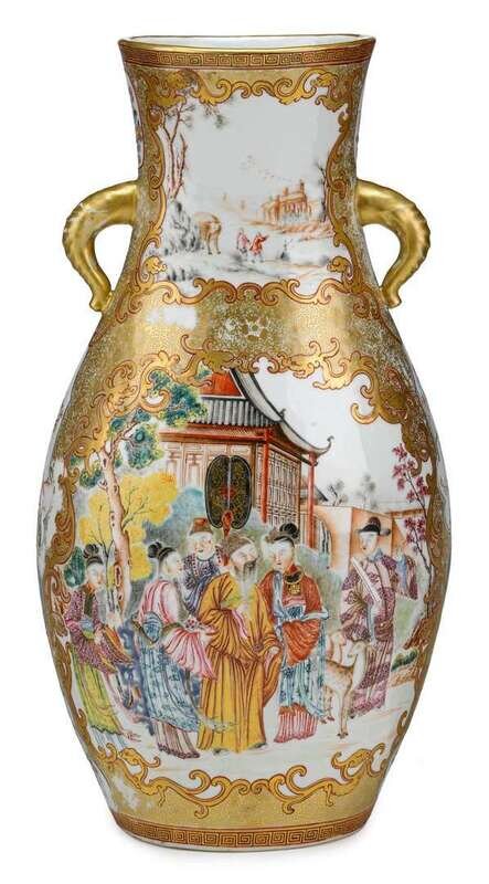 Flattened hu-form, the body well-painted to show figures in courtyard settings, surrounded by ornate gilt scrolls, the neck with two sepia reserves depicting European subjects, mounted with twin gilt stylised elephant-trunk handles, Greek key around the rim and foot.